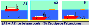 L'action A, qui a commencé avant B, se termine après elle, et le bateau arrive au fond.