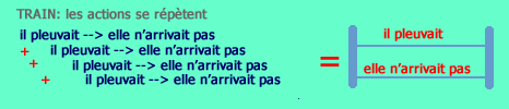 Même si elle arrête d'être gênée par la pluie par la suite, l'important est qu'au début de la nouvelle action, elle a du mal à s'endormir quand il pleut. Ceci est symbolisé, sur notre graphique, par la flèche qui montre que le train est encore en route.